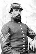Service: Priv. - Res. Stoughton ; boot maker ; 25 ; enl. and must. June 26, 1861; taken prisoner at Gettysburg, Penna., July 1, 1863. Confined at Richmond, Va. July 21, 1863, paroled at City Point, Va. August 12, 1863. He was detached as a Guard at the Brigade Headquarters from November 1863 - April 1864. Mustered out July 8, 1864. [Description: 5" 10; dark complexion; black eyes; dark hair]. Born at North Bridgewater, Massachusetts September 16, 1835; died at Stoughton, Mass. August 14, 1906, due to jaundice. He married (1) at Stoughton, Mass. December 25, 1857 by Rev. J.M. Dennis to Abbie Frances Holbrook, she died at Stoughton February 4, 1882. He married (2) at Leominster, Mass. May 28, 1892 to Louisa Augusta Chase. Buried at the Evergreen Cemetery, Stoughton, Mass. [Click here for his obituary].