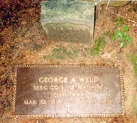 Service: Corpl.- Res. Stoughton; bootmaker; 42 ; enl. and must. June 26, 1861; disch. for disability, Feb. 9, 1863. Born at Lebanon, N.H. March 10, 1818; died at Sharon, Mass. October 21, 1876, due to suicide. George is buried at the Moose Hill Cemetery in Sharon, Mass. Many thanks for the above photos of George A. Weld courtesy of his 3rd-great grand-daughter Kitty Grabelski