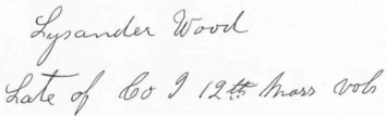 WILLIAM A. WOOD - Priv. - Res. East Boston ; clerk ; 18 ; enl. and must. June 26, 1861; wounded Sept. 17, 1862, at Antietana, Md.; and May 3, 1863, at Chancellorsville, Va.; must, out July 8, 1864.