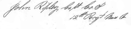 Service: Captain Res. Stoughton; mason; 28; comm. and must. June 26, 1861; wounded Aug. 9, 1862, near Cedar Mountain, Va.; Sept. 17, 1862, at Antietam, Md.; and Dec. 13, 1862, at Fredericksburg, Va. Born at West Bridgewater, Mass. March 5, 1833; died at Falmouth, Virginia (or Washington, D.C.) Dec. 20, 1862, age 29 yrs. 9 mos. 15 dys., due to of wounds received at Cedar Mountain. John was a son of Marlboro and Daty (Bray) Ripley of West Bridgewater, Mass. There is a gravestone for Capt. Ripley at Pine Hill Cemetery, West Bridgewater, Mass.
