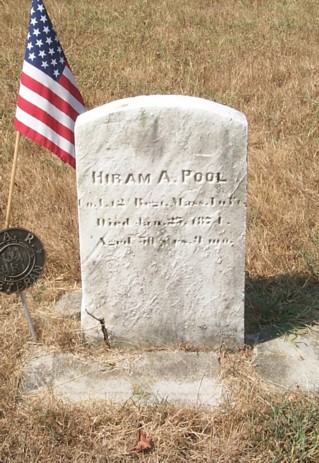 Service: Priv.- Res. Stoughton ; gilder; 37; enl. and must. June 26, 1861; must, out July 8, 1864. Born at Bridgewater, Mass. April 25, 1823; died at Stoughton, Mass. January 25, 1874, due to chronic diarrhea. Hiram was married at Stougton April 19, 1843 by Rev. Henry Eddy to Caroline A. White. He is buried at Evergreen Cemetery, Stoughton with a town headstone marked with "Comrade" on the reverse.