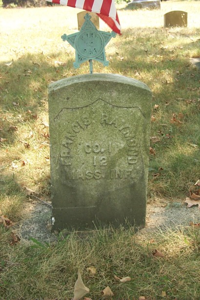 Service: Priv. Res. Stoughton ; bootmaker; 19; enl. and must. June 26, 1861; taken prisoner July 1, 1863, at Gettysburg, Penna.[and confined at Richmond, Va. July 21, 1863, paroled at City Point, Va. Aug. 2, 1863; exchanged March 8, 1864; must, out July 8, 1864. See Hancock's Corps (U. S. Vet. Vols.). [Description: 5" 8; dark complexion; blue eyes; dark hair]. Born at Randolph, Mass. December 18, 1842; died at 653 Park St., Stoughton, Mass. September 20, 1919, due to chronic interstitial nephritis. Francis was married at Stoughton November 17, 1869 by Rev. A. St. John Chambre to Mary Ella Burnham. He was buried at Evergreen Cemetery, Stoughton. He lived at 653 Park St., Stoughton in 1919. Francis was a son of Jonathan and Mary A. (Hayden) Raymond.
