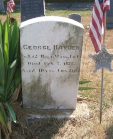 Service: Priv. Res. Stoughton ; bootmaker; 22 ; enl. and must. June 26, 1861; wounded in action Sept. 17, 1862, at Antietam, Md.; discharged for disability, Nov. 13,1862, from wounds received in action. [Description: 5" 6 1/2; dark complexion; blue eyes; dark hair]. Born at Boston, Mass. November 20, 1839; died at Turnpike St., North Stoughton, Mass. April 12, 1914. is buried at Maplewood Cemetery, off Pleasant St., Stoughton, Mass. [Click here for his obituary].