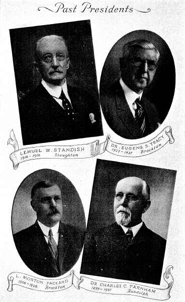 Among those present were Dr. T. H. Dearing, Braintree; Leander Soule, Taunton; Charles F. Porter, Brockton; Alanson Belcher, Stoughton; Dr. C. C. Farnham, Randolph; James S. Allen, Bridgewater; L. Morton Packard, Brockton; Leander Curtis, Rockland; E. A. Jones, Stoughton; John B. Thayer, Randolph; Sanford W. Billings, Sharon; Elijah G. Capen, Stoughton; Lewis Porter, Brockton; Cornelius Faunce, North Abington.