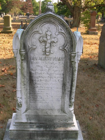 Rev. ALBERT PERRY, born at Rindge, N.H. 17 December 1820; died at New Ipswich, N.H. 17 June 1862.. - First Congregational Church 1851-1856. He was called from New Ipswich to be their pastor 26 September 1850. He was installed 8 January 1851, and resigned due to poor health on 21 June 1856. Rev. Perry was pastor during the construction of the 1850's edifice on Washington Street [site now where the the gas next to the V.F.W. stands. The new church was dedicated 28 January 1852 at a cost of $12,000. His parsonage was the house standing to the right of the gas station on Washington Street. The old church was destroyed by fire on 9 March 1942. Rev. Perry and his family are buried at the Evergreen Cemetery, Stoughton.